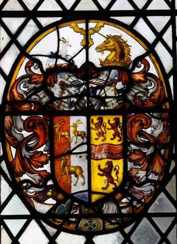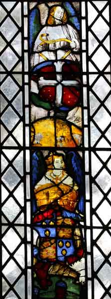 These three lancet windows contain mainly 16th/17th century glass which was originally located in the Deanery. The main exceptions are: a 17th century roundel of St John the Evangelist with an Eagle and the 16th Century St Godelva being strangled, which are both from the Bracon Ash Collection. The window was retored and arranged by G King & Son.