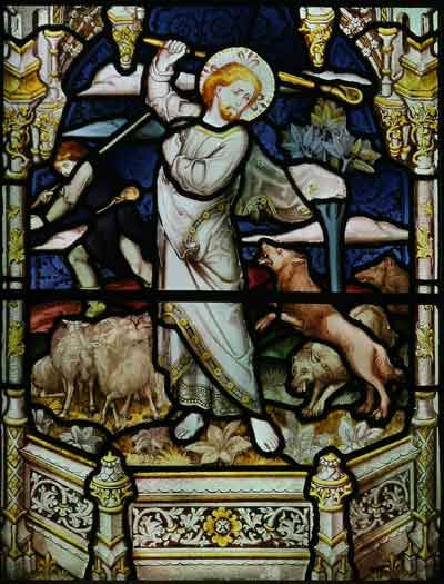 Made by J Hardman & co the panels at the base of the window show Christ as "The Good Shepherd" whilst the main panels show Christ in scenes from the Gospels where he looks after his "flock"