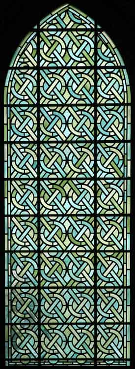 Windows S1, S2, S3 in the Chapel of the Blessed Sacroment all contain glass with geometric patterns in a subdued green/grey palette.