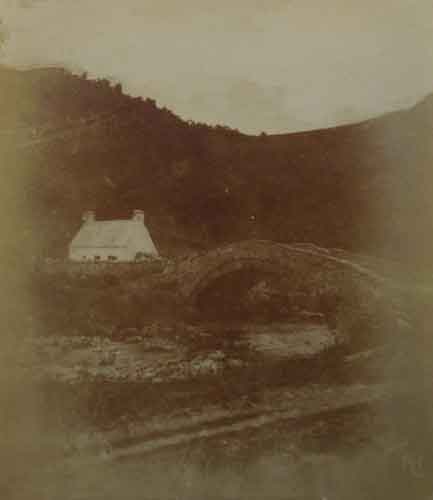 Bridge over rocky river bed distant view, north Wales